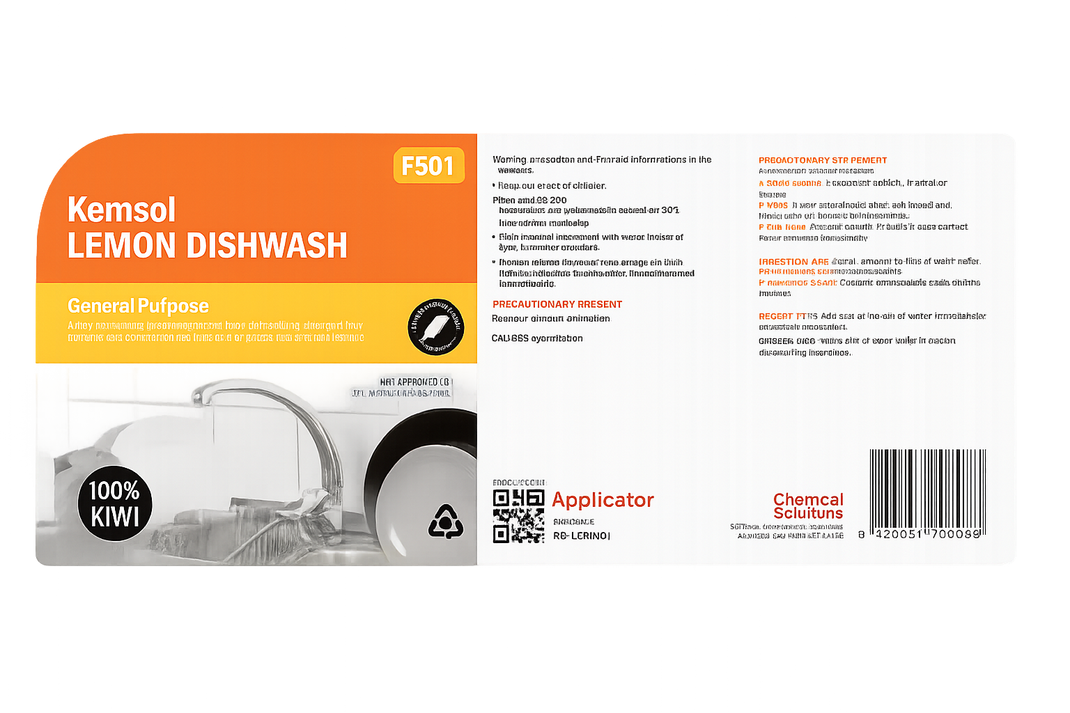 Replacement application label for Lemon Dishwash bottles. Can be used to replace old or missing labels and clearly displays essential product and safety information for easy identification and compliance.