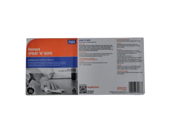 Replacement application label for Spray n Wipe bottles. Can be used to replace old or missing labels and provides clear product and safety information for easy identification and compliance.